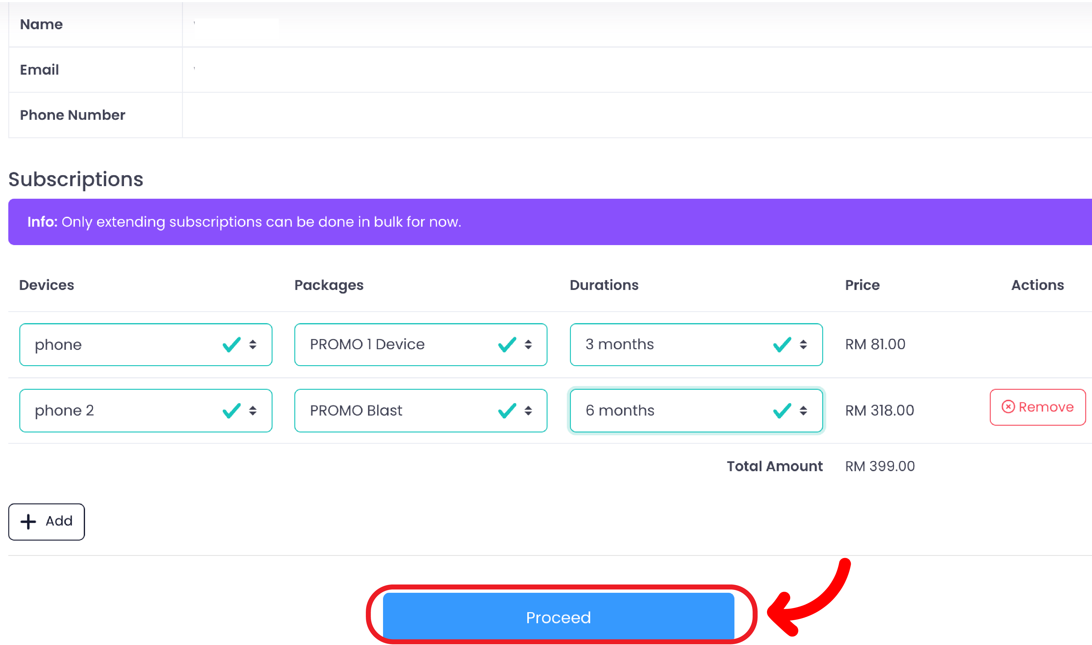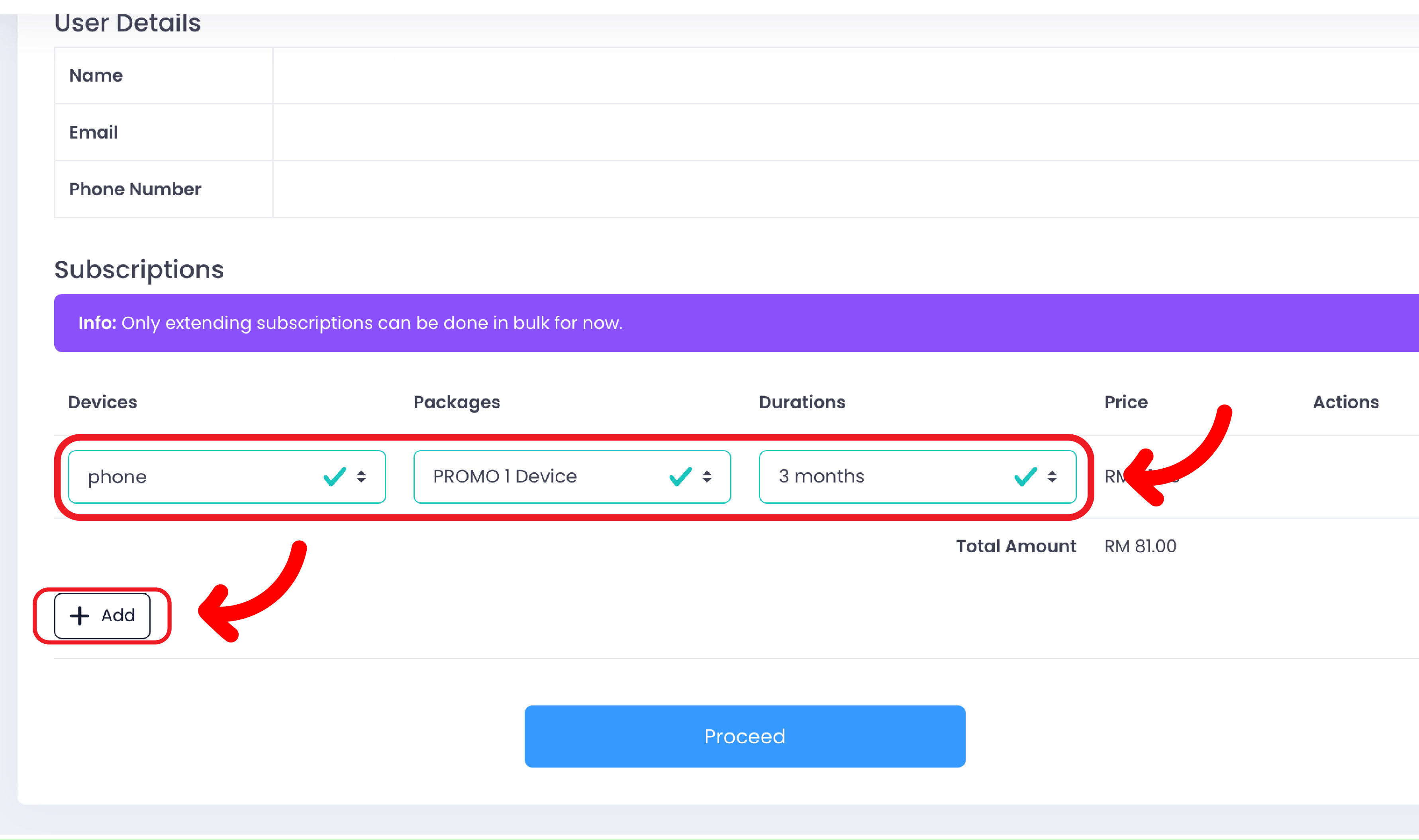 Select your "Devices", "Packages" and "Durations". Additionally, you can add a device by clicking the "Add" button.