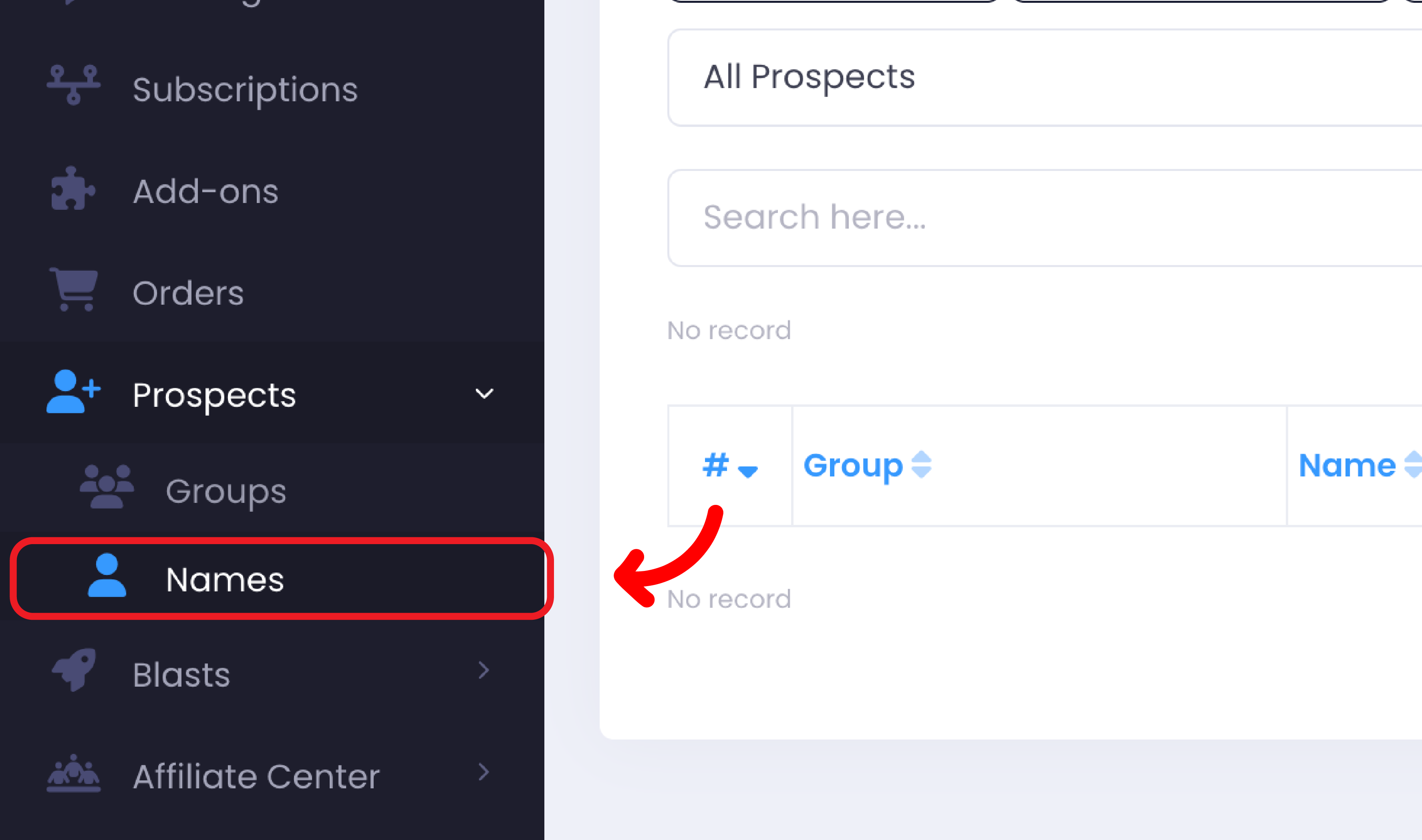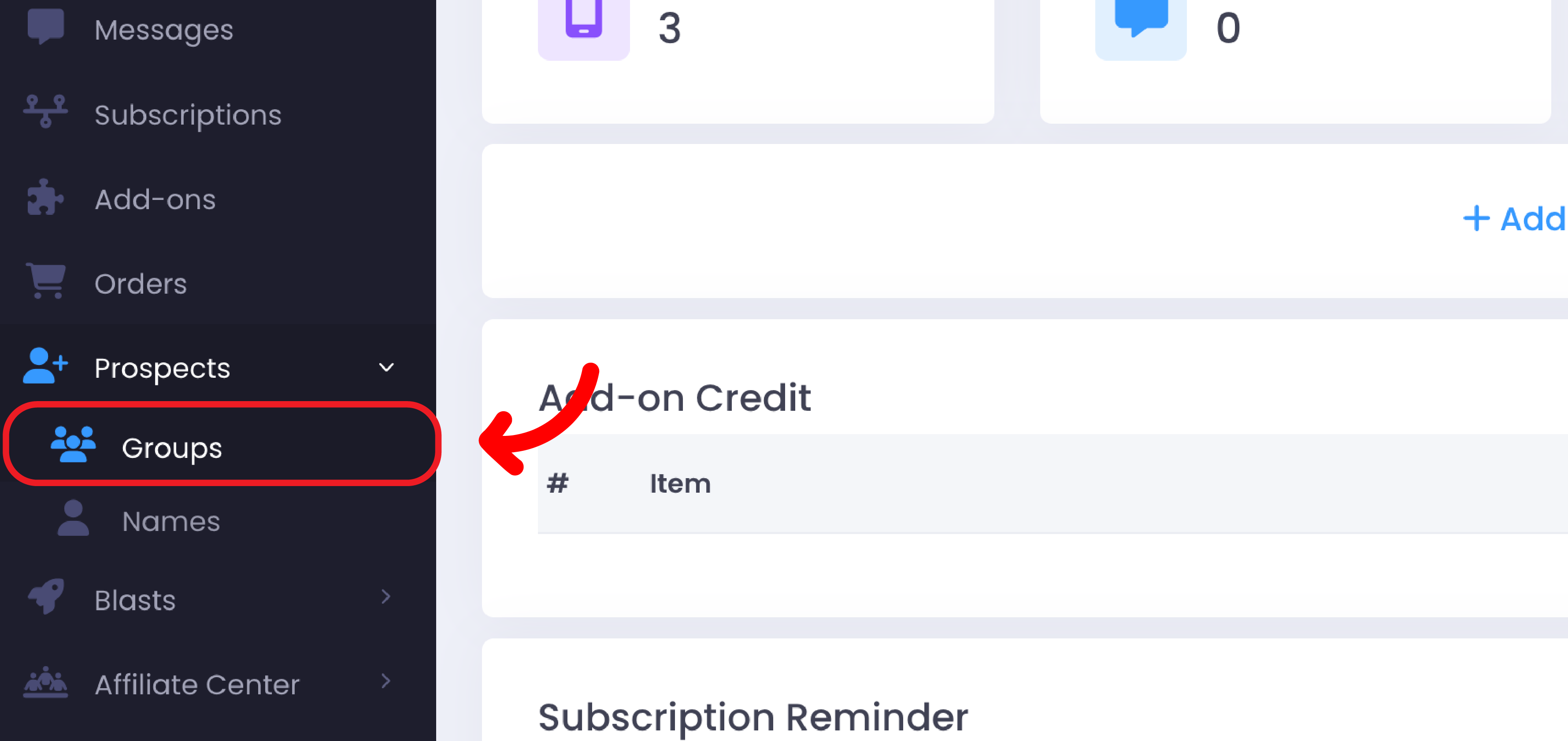 1. Login to your OnSend account and click on "Prospects" tab and choose "Groups".